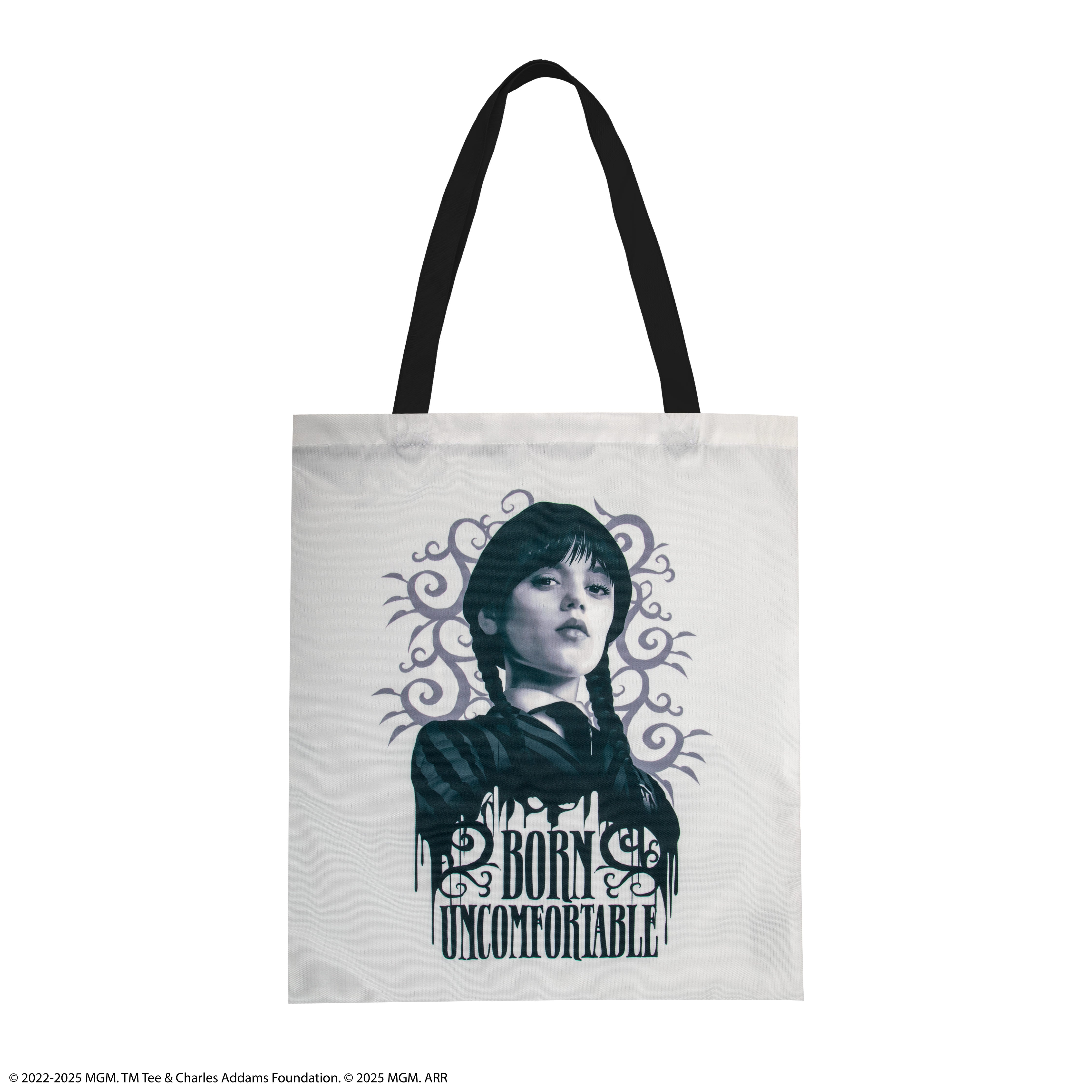 Mercredi Addams arbore son expression impassible caractéristique, encadrée par des motifs sombres tourbillonnants et la citation « Born Uncomfortable » (Née male à l'aise) sur un côté. L'autre côté met en scène son fidèle compagnon, La Chose, sous la phrase pleine d'esprit « Single-Handedly Handy » (Manuel à lui seul), qui capture parfaitement le mélange d'humour noir et de charme étrange de la série.