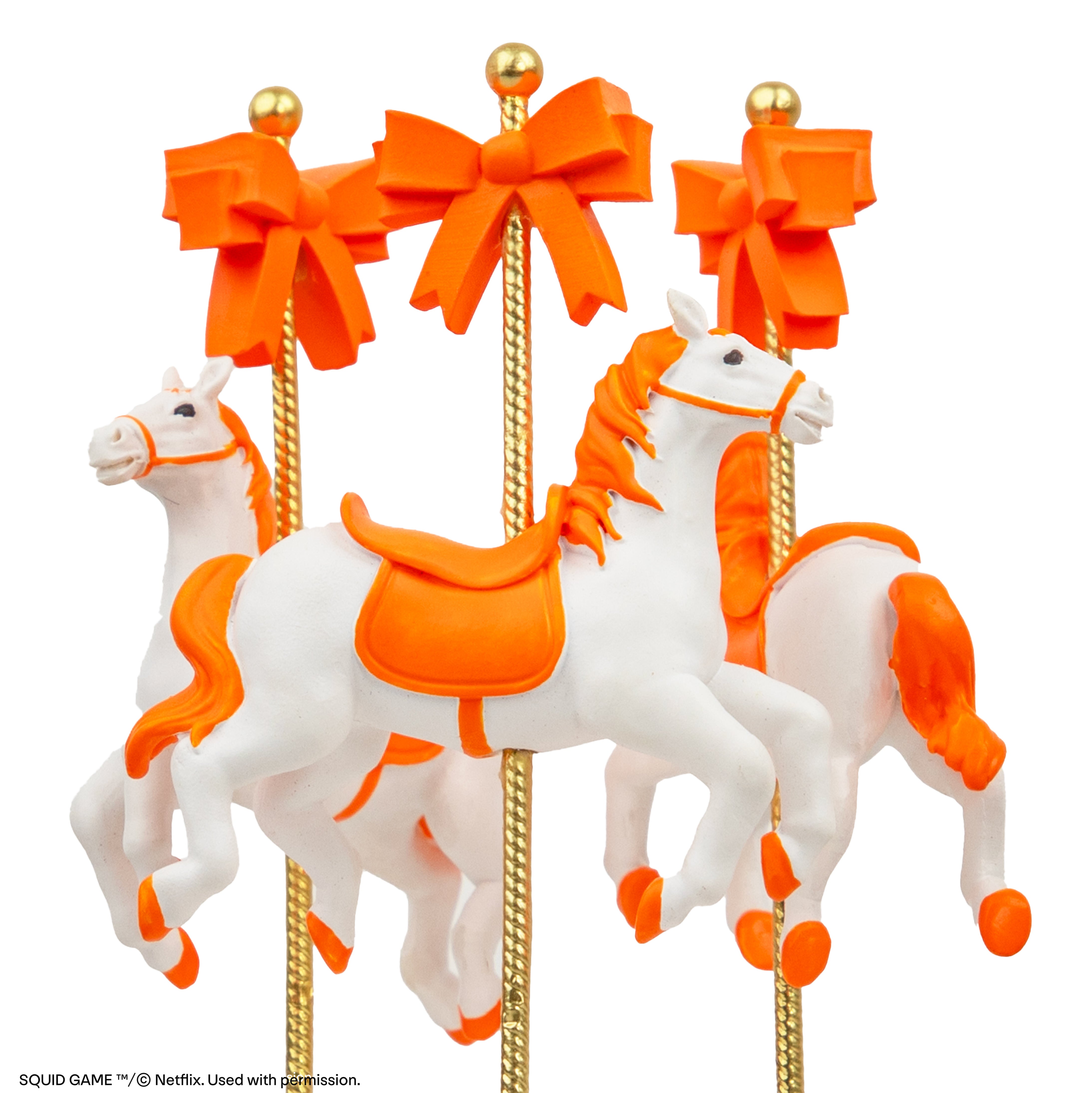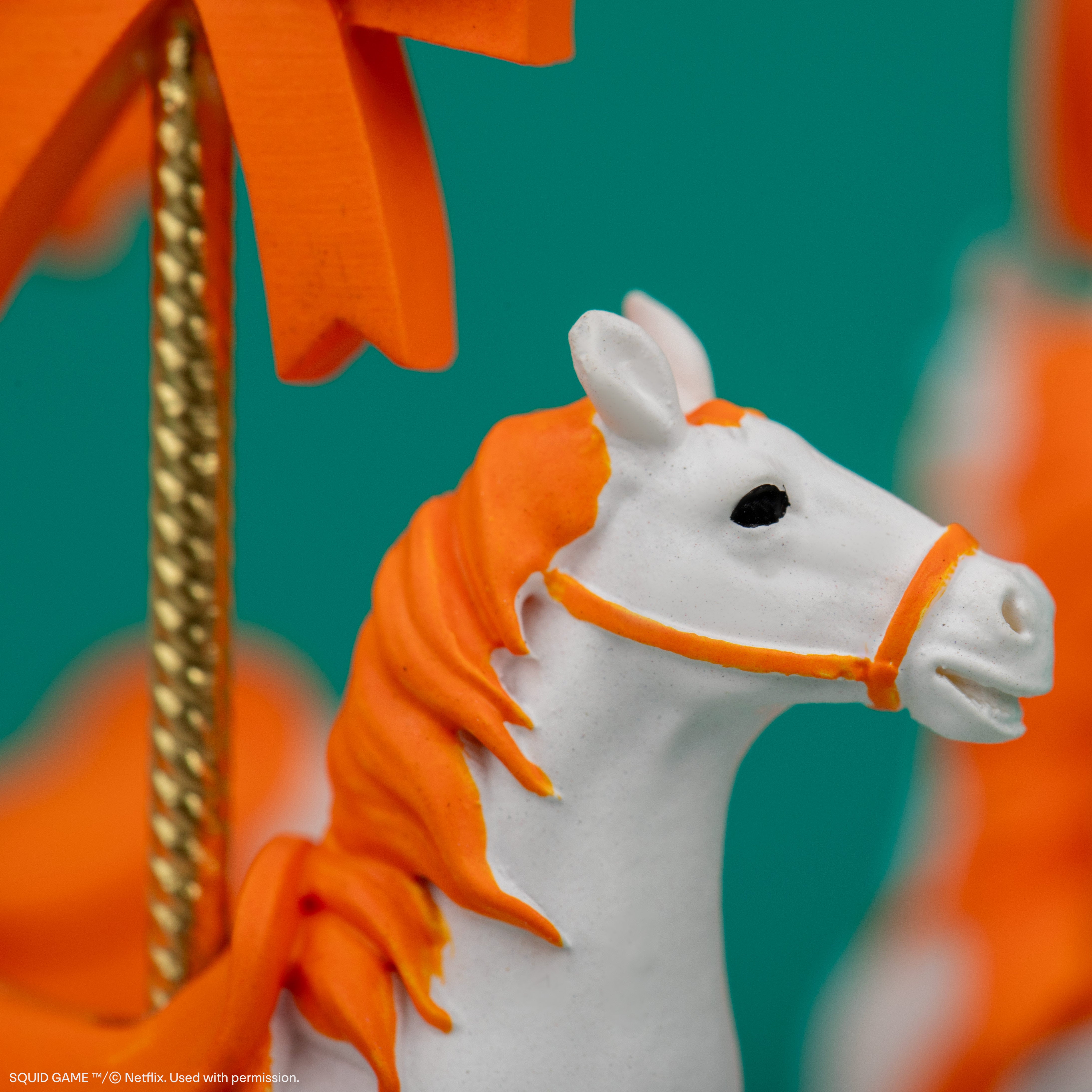 Plongez dans l'élégance inquiétante de Squid Game avec cette boîte à musique réplique de carrousel, inspirée du jeu inoubliable. Avec ses chevaux de carrousel détaillés, ses accents orange vifs et sa finition décorative haut de gamme, cette pièce de collection capture le charme troublant de la série. Fidèle à la série, le carrousel tourne et joue la musique entendue dans le jeu, ce qui en fait un objet de décoration saisissant pour les fans et les collectionneurs.