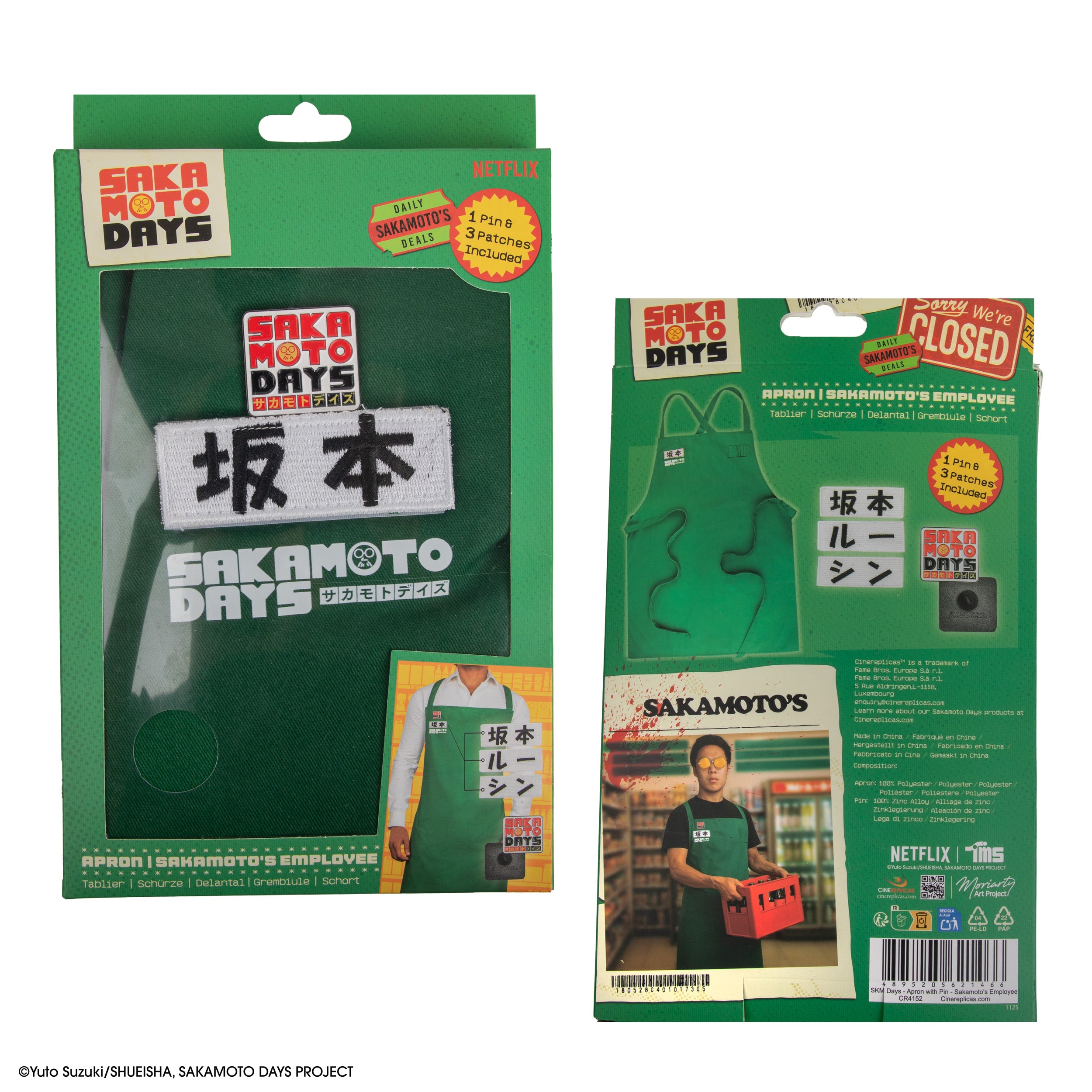 Passez derrière le comptoir avec le tablier Sakamoto Days. Cet ensemble collector comprend un tablier vert, un pin's métallique avec le logo Sakamoto Days et trois écussons velcro interchangeables au nom des différents employés du magasin, permettant aux fans de recréer le look emblématique de Taro Sakamoto en magasin avec des détails authentiques. Conçu avec des lignes épurées et un tissu résistant, c'est un produit dérivé officiel de la série qui se démarque.