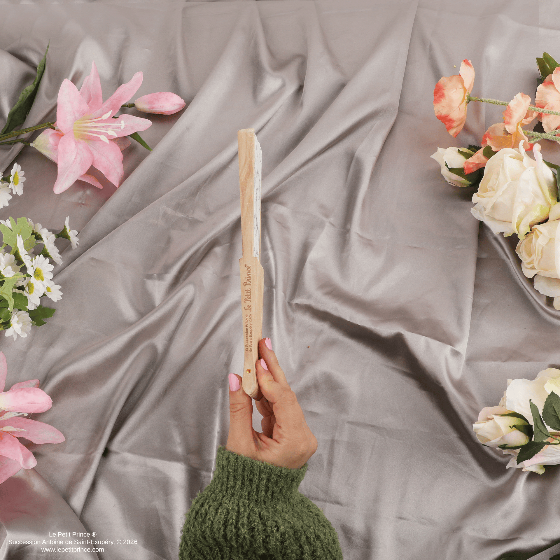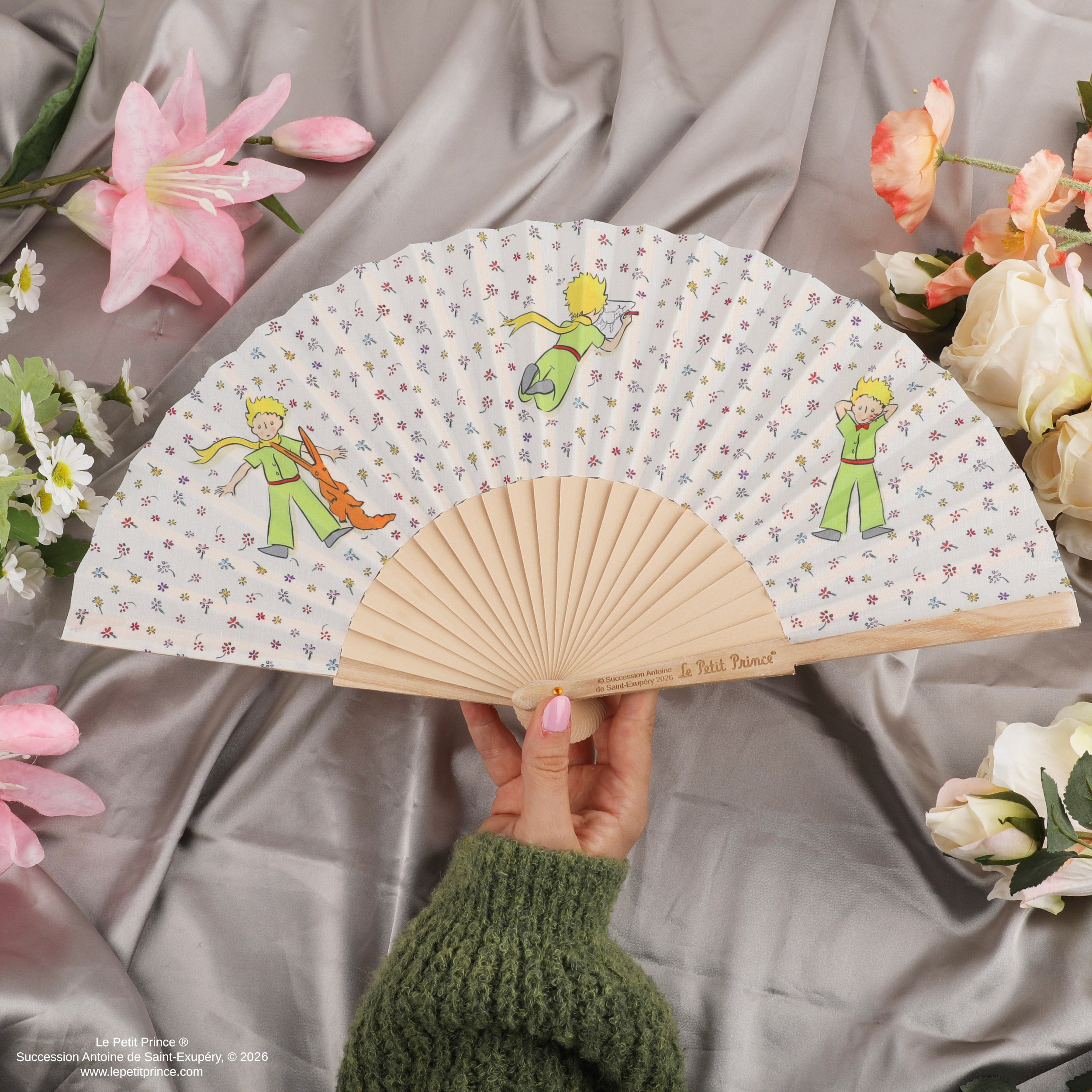 Cet éventail pliable vous emmènera dans un paisible jardin de fleurs sauvages. Le Petit Prince et son fidèle renard apparaissent dans des poses ludiques et rêveuses sur un fond ivoire doux, parsemé de délicates fleurs multicolores, créant un design léger et poétique inspiré d’un jardin.